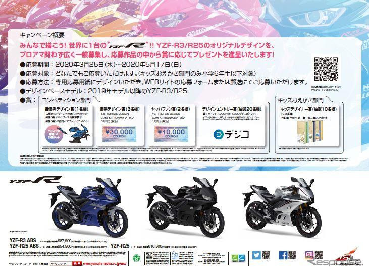 ヤマハ発動機販売は「YZF-R3/R25デザインコンペティション」を開催、オリジナルデザインの募集を開始した。最優秀デザイン賞には、応募時のデザインを再現した外装キットがプレゼントされる。応募締切は5月17日。