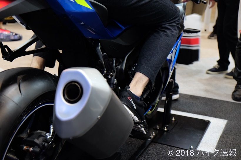 跨ってみたら、かなり前傾になったから長距離はキツいけど、跨りやすくてニーグリップしやすく、足つきもなかなか良くて、なかなか良さげだった。