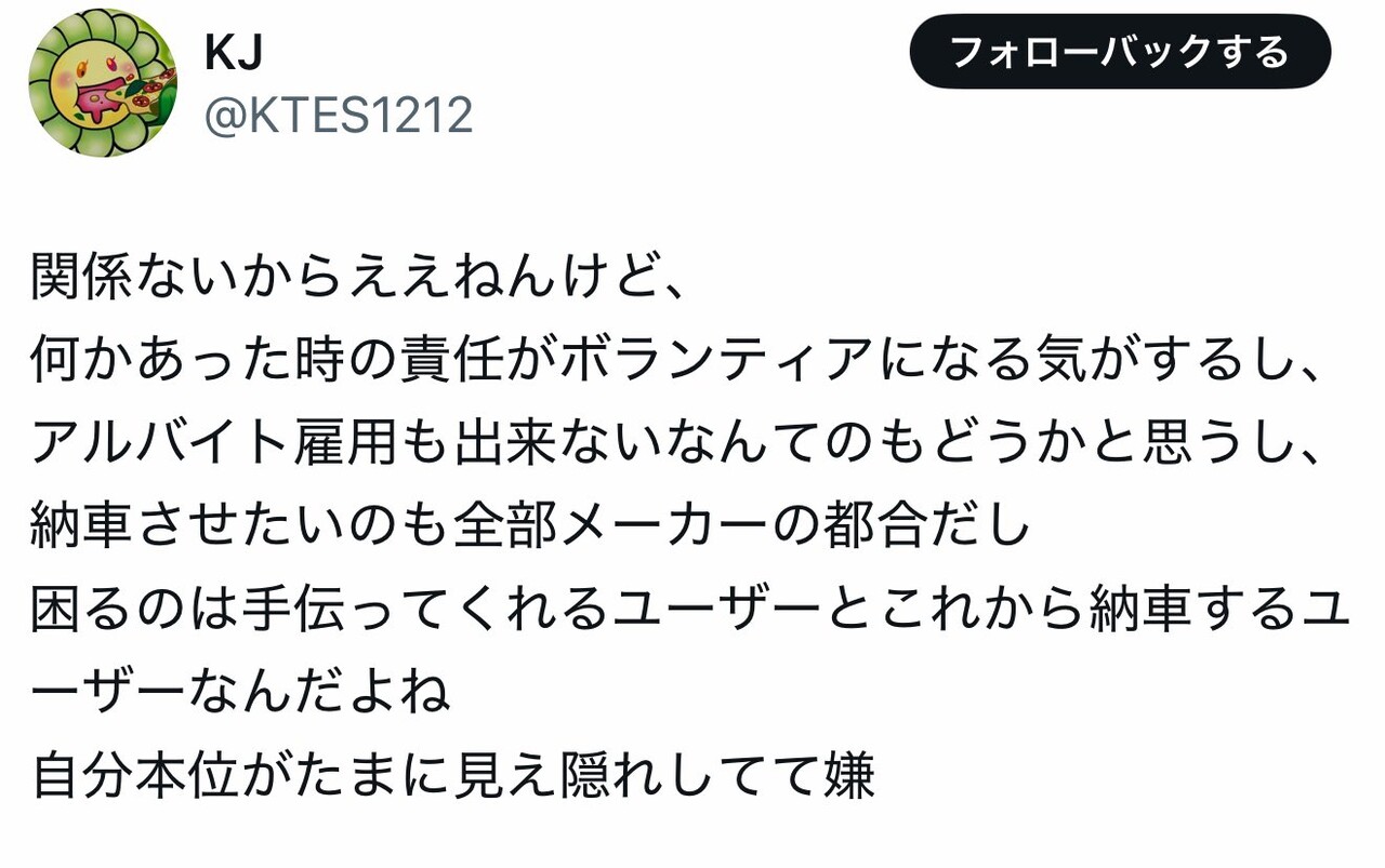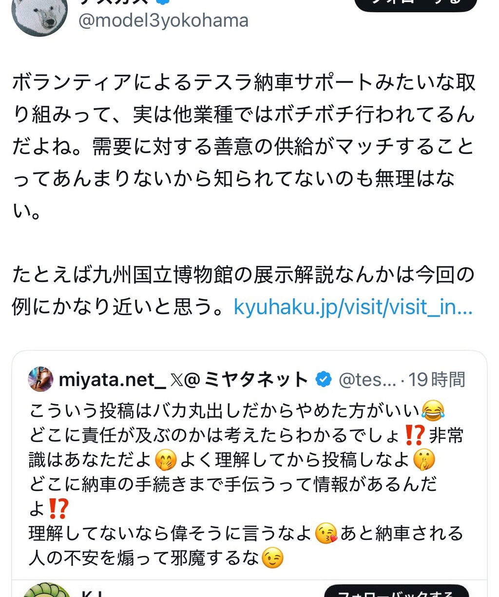 新型の納車で初オーナーだったが、情報収集のため日本のテスラに乗っている方のポストを見ていて正直買う気が失せてきてしまっている。2年近くテスラを買うタイミングを待ち、念願の納車だったのに公認オーナーズクラブがこれで、X上で目立つ人間がこのような人間が多いと一緒くたに見られてしまう。