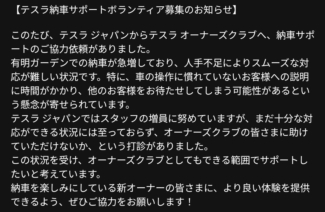 詳細は確認中だが、テスラが人手不足の補助に、納車説明をボランティアにやらせる動きが有るらしい。この案件から見えて来るテスラの重要な論点が有る。… pic.twitter.com/xCqwt03ami