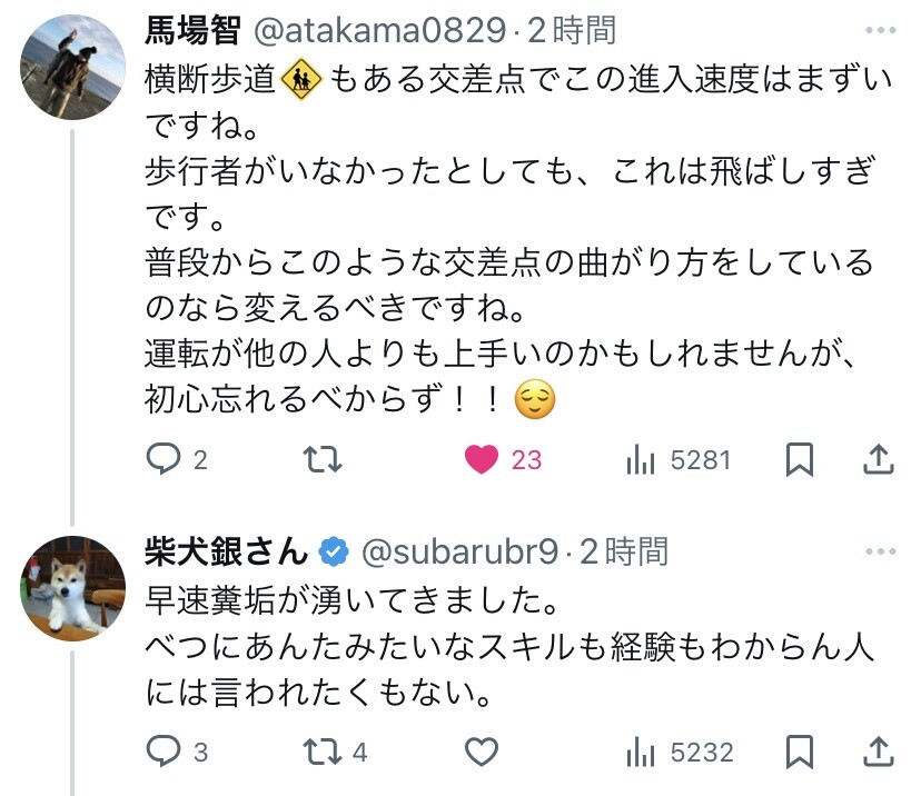 歩行者がいなかったから良かったものの、いたらどうすんのよ?このスピードで曲がれたとしても歩行者がいたら大惨事。まじで初心忘れるべからずなのに、その返信がクソ垢呼ばわり。